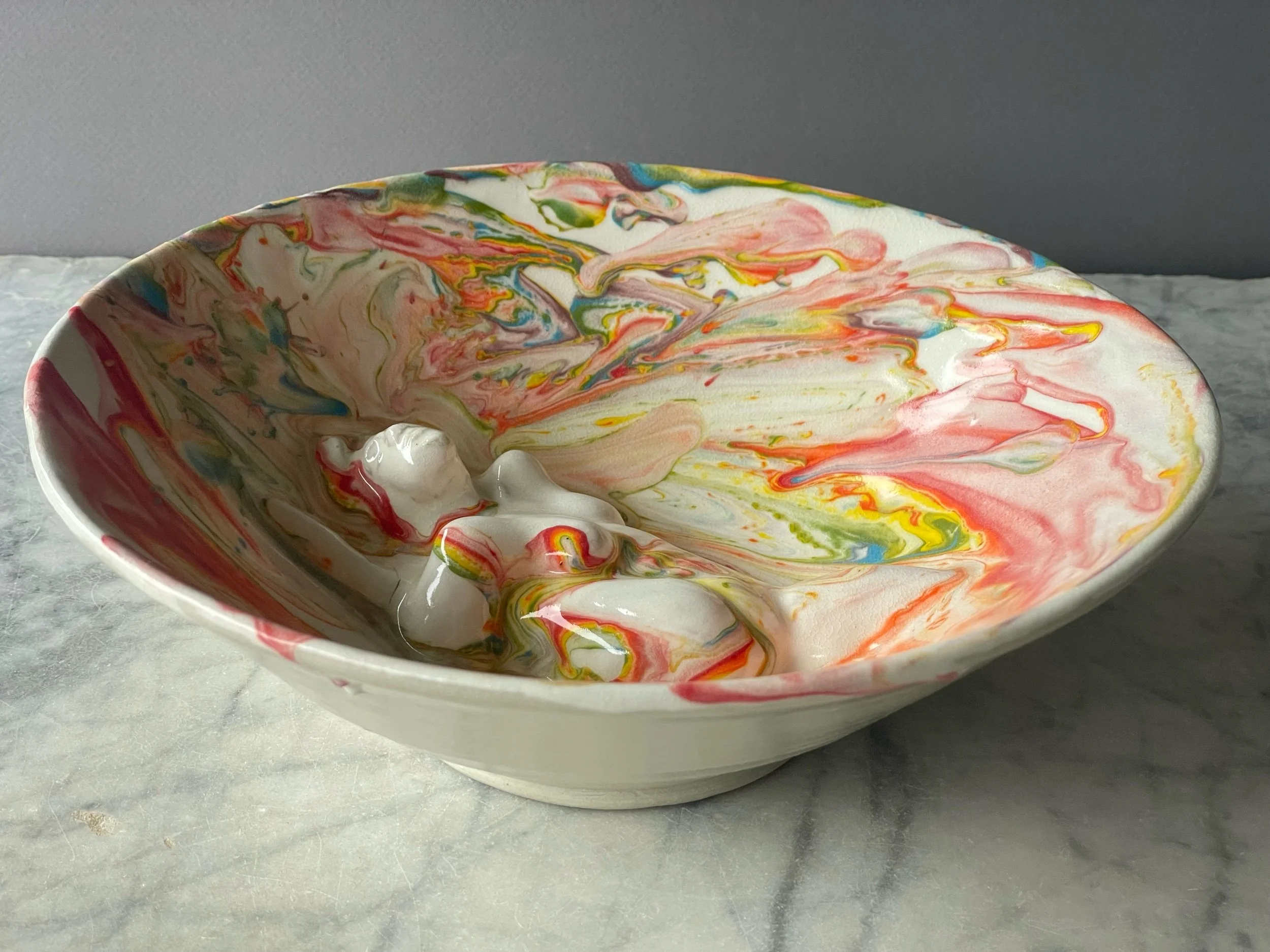 This wheel thrown bowl has a sculpted nude contortionist figure emerging from the center, stretching her leg behind her shoulder. I have 2 versions of this piece: a rainbow marbled colored clay and clear glaze version, and a black golden bronze glazed version.