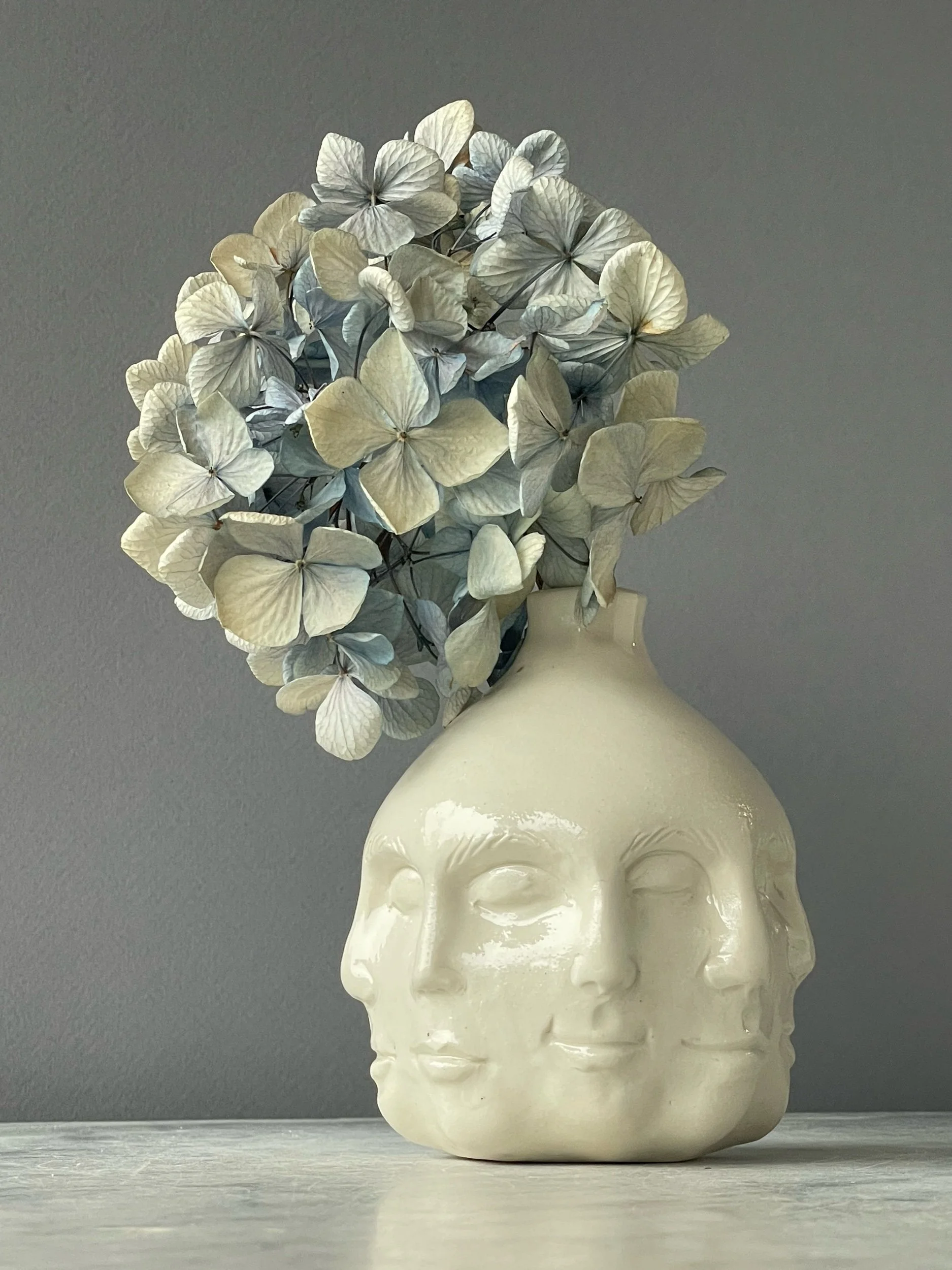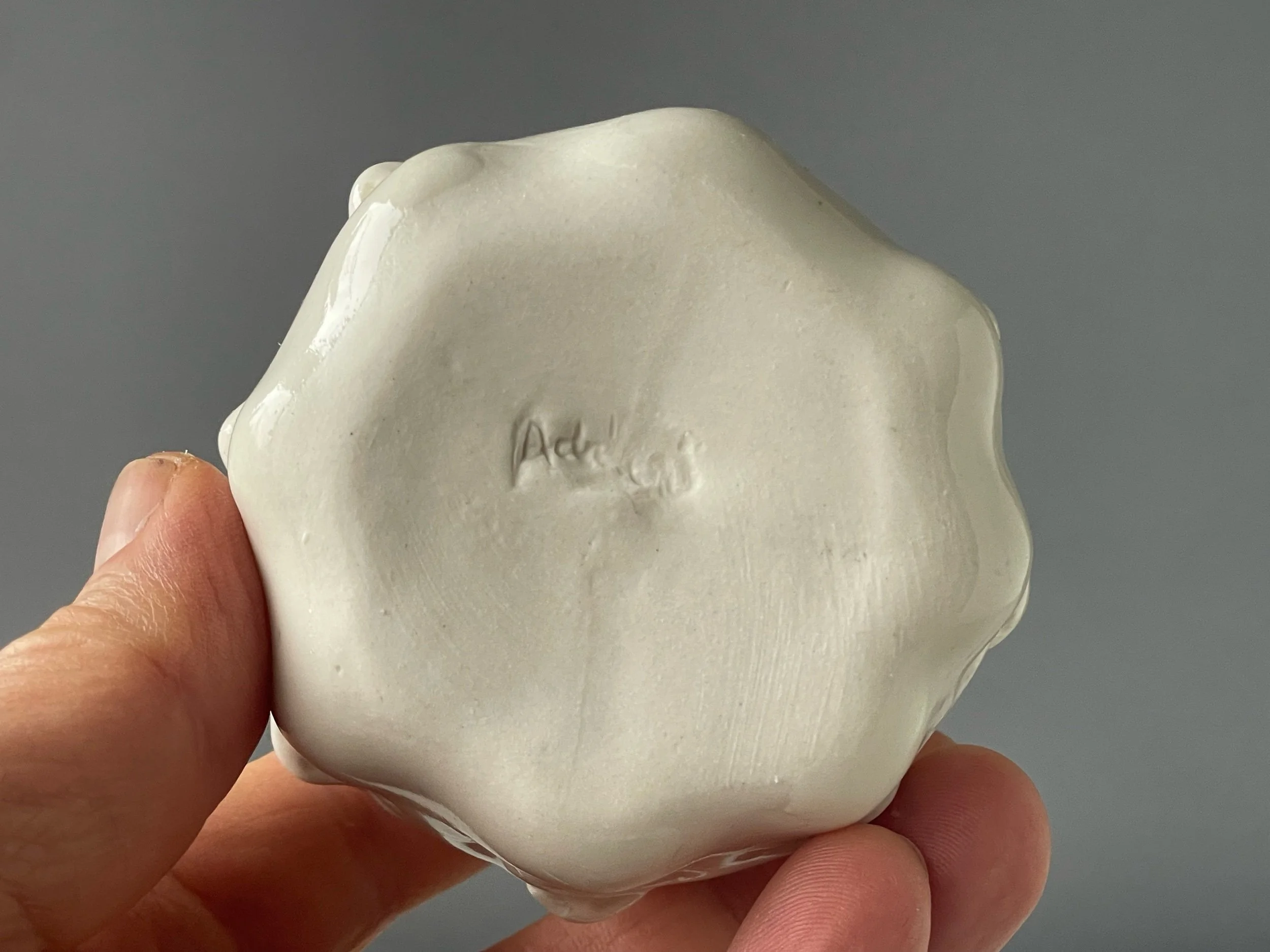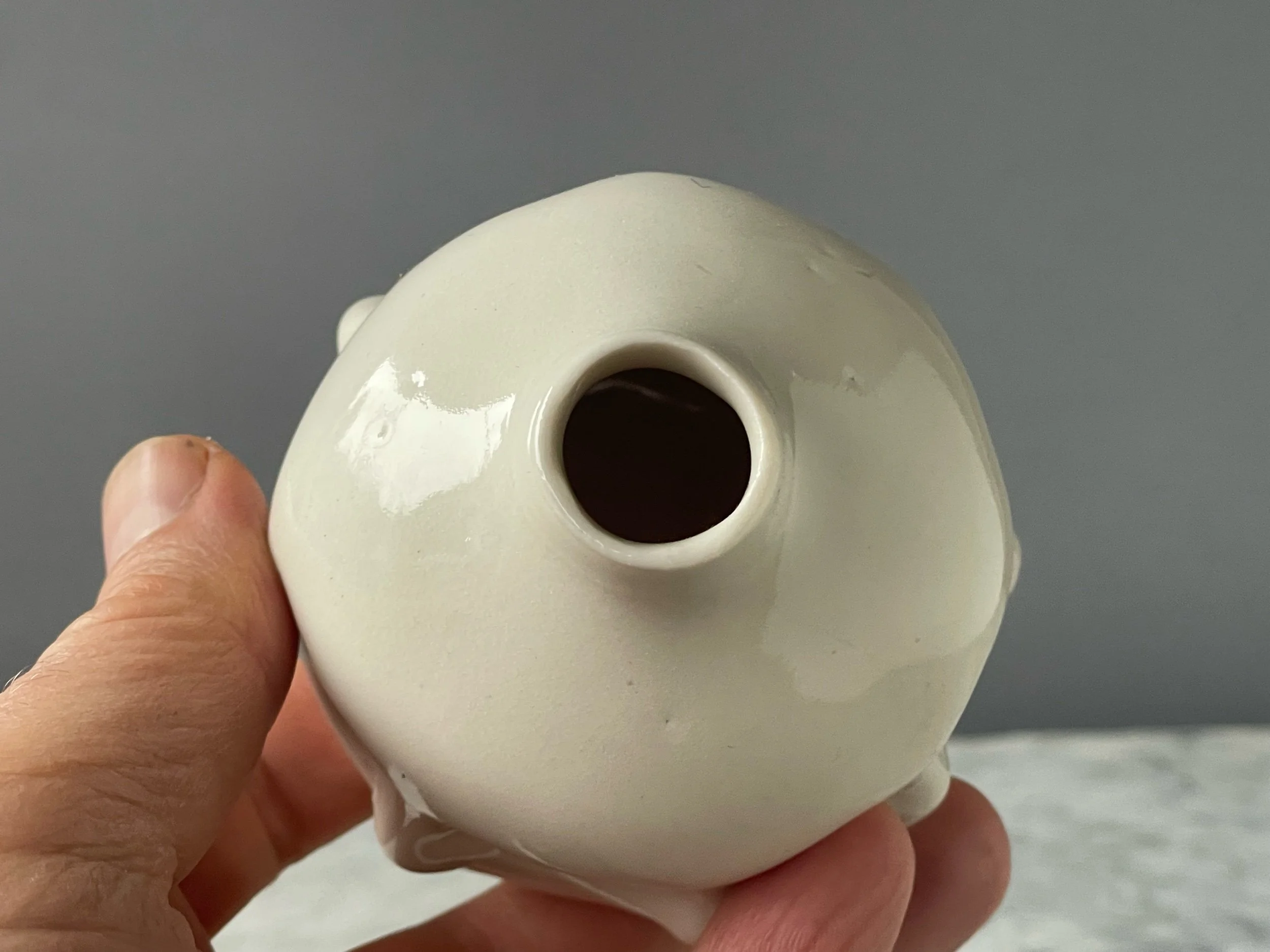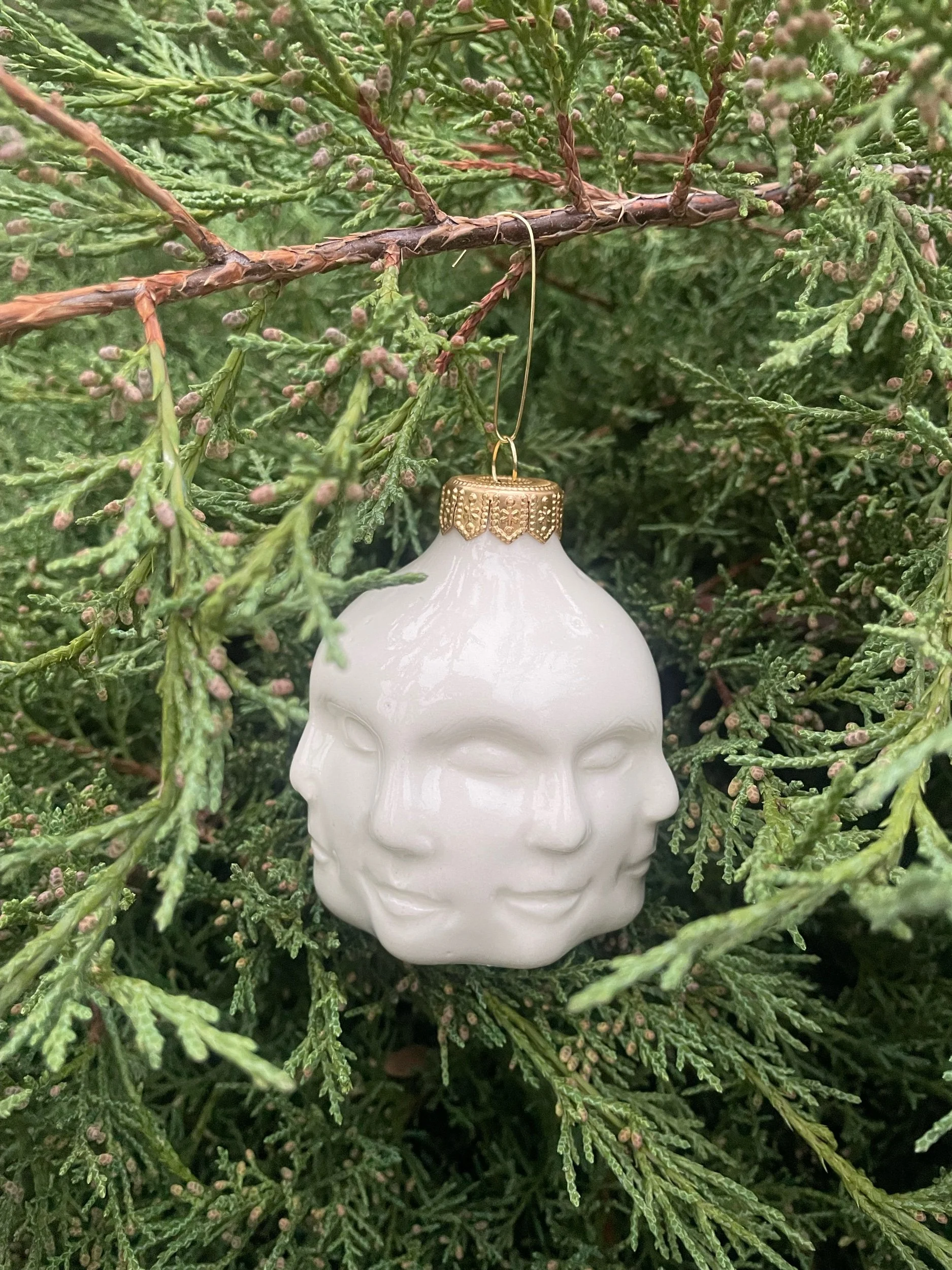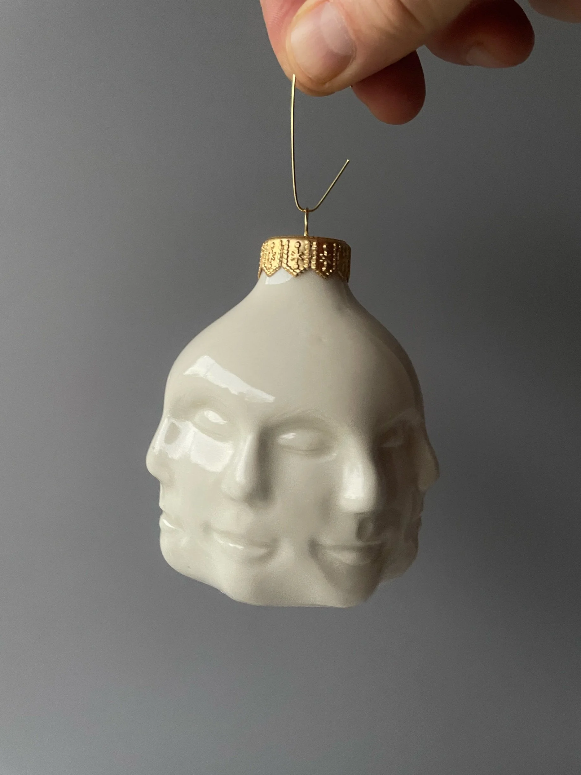 These slip cast porcelain ornaments give a slightly trippy version of classic tree ornaments. They have eight faces sculpted around the outside, capped with a gold colored top and hanging wire. You can easily remove the cap when the holidays are over, and use this piece as a small bud vase.
