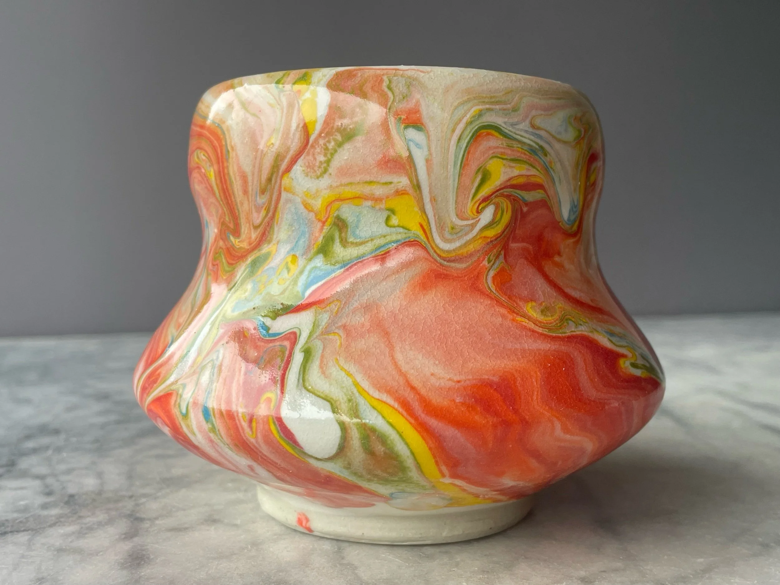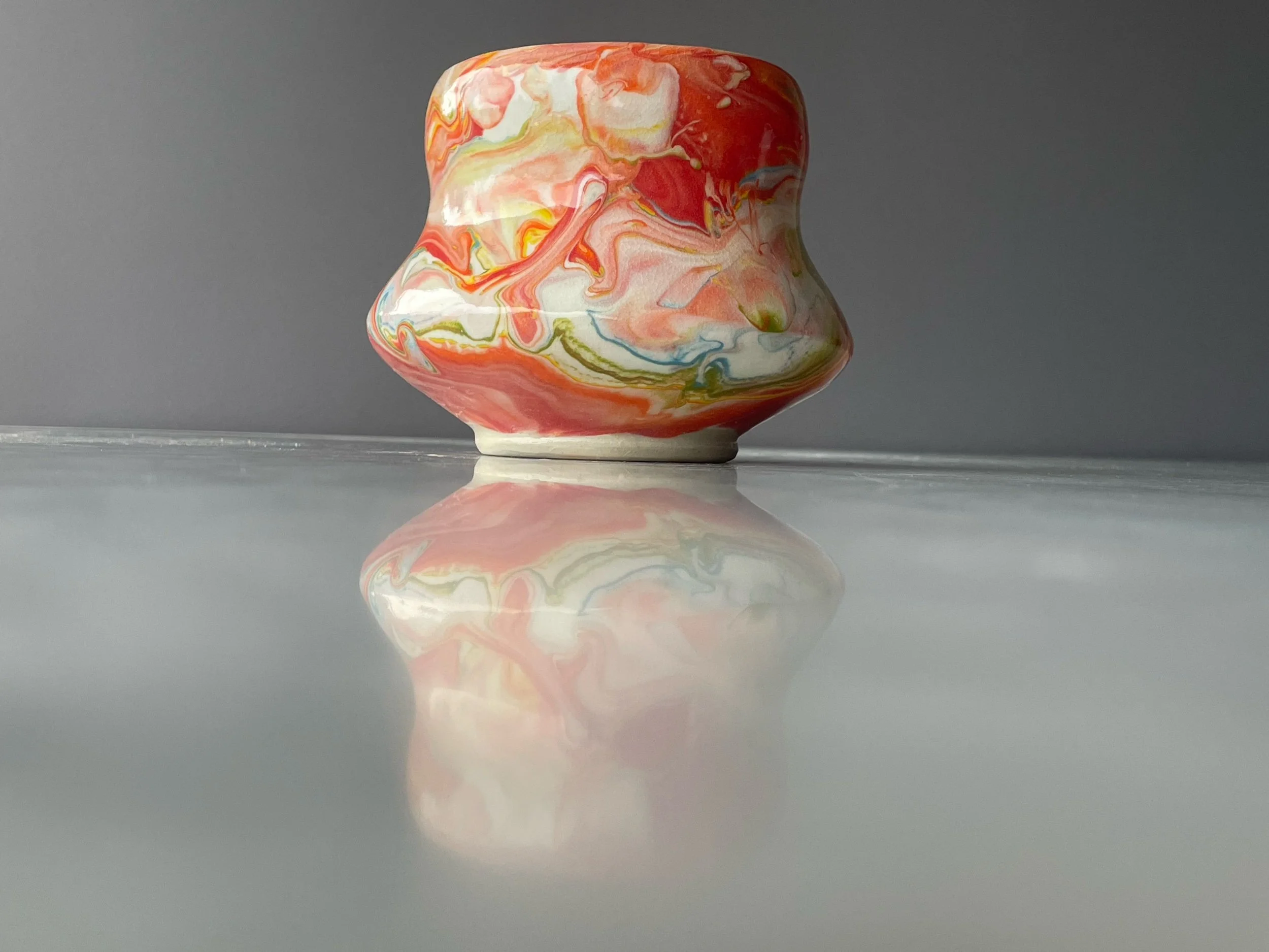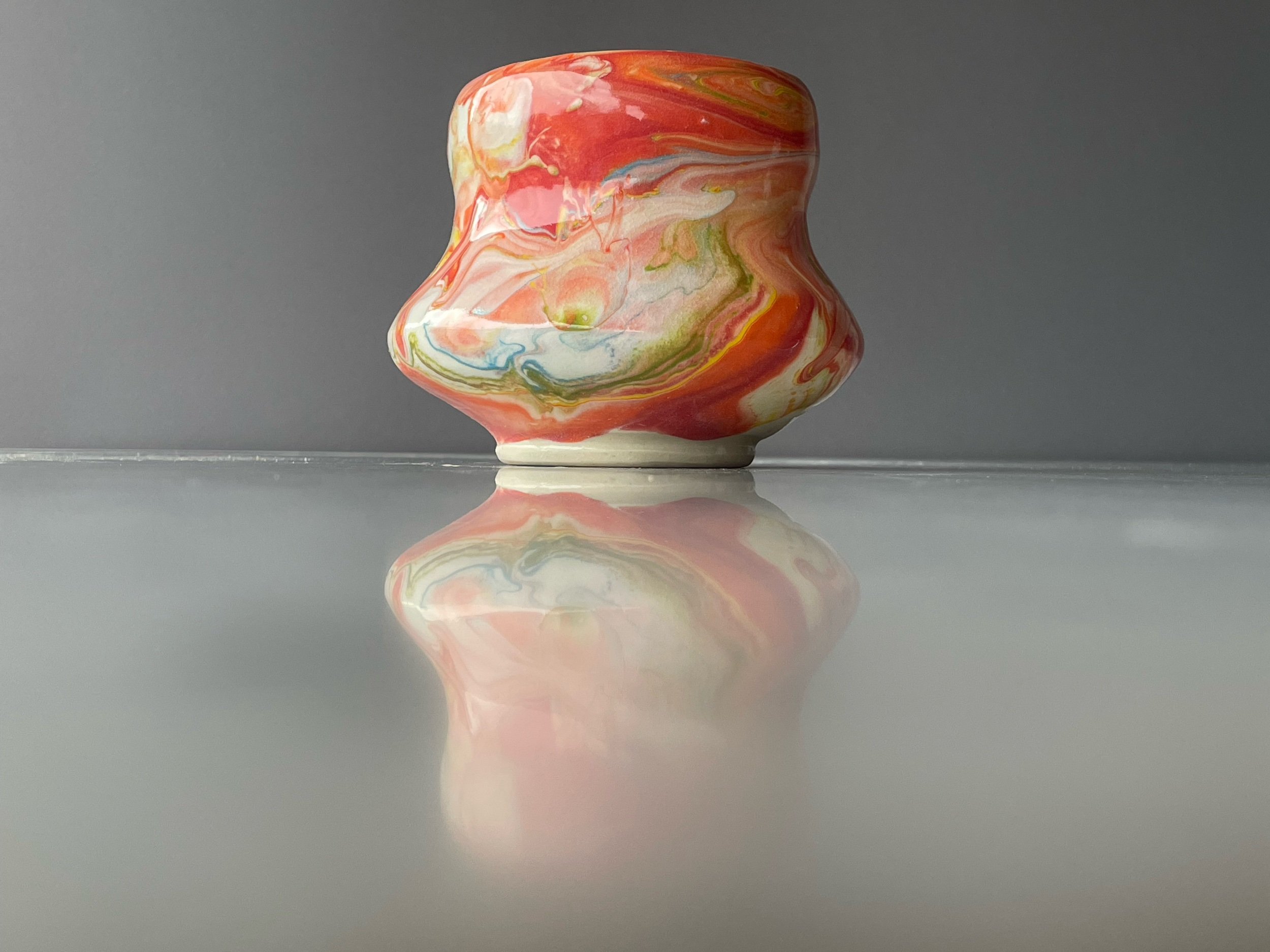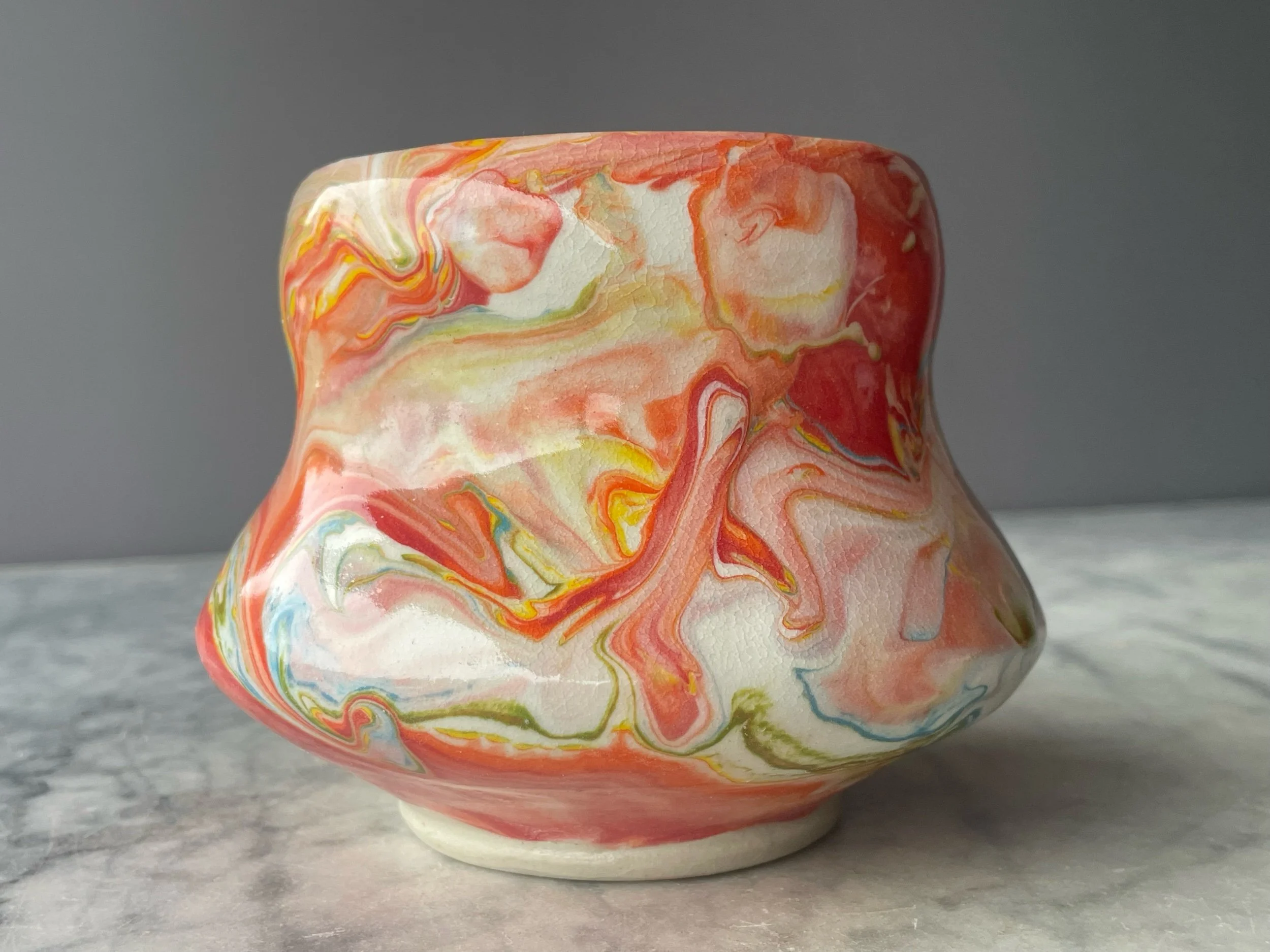 This wheel thrown tea bowl has a wildly marbled exterior, and a white glazed interior. It has a sweetly undulating form that feels good in the hand.