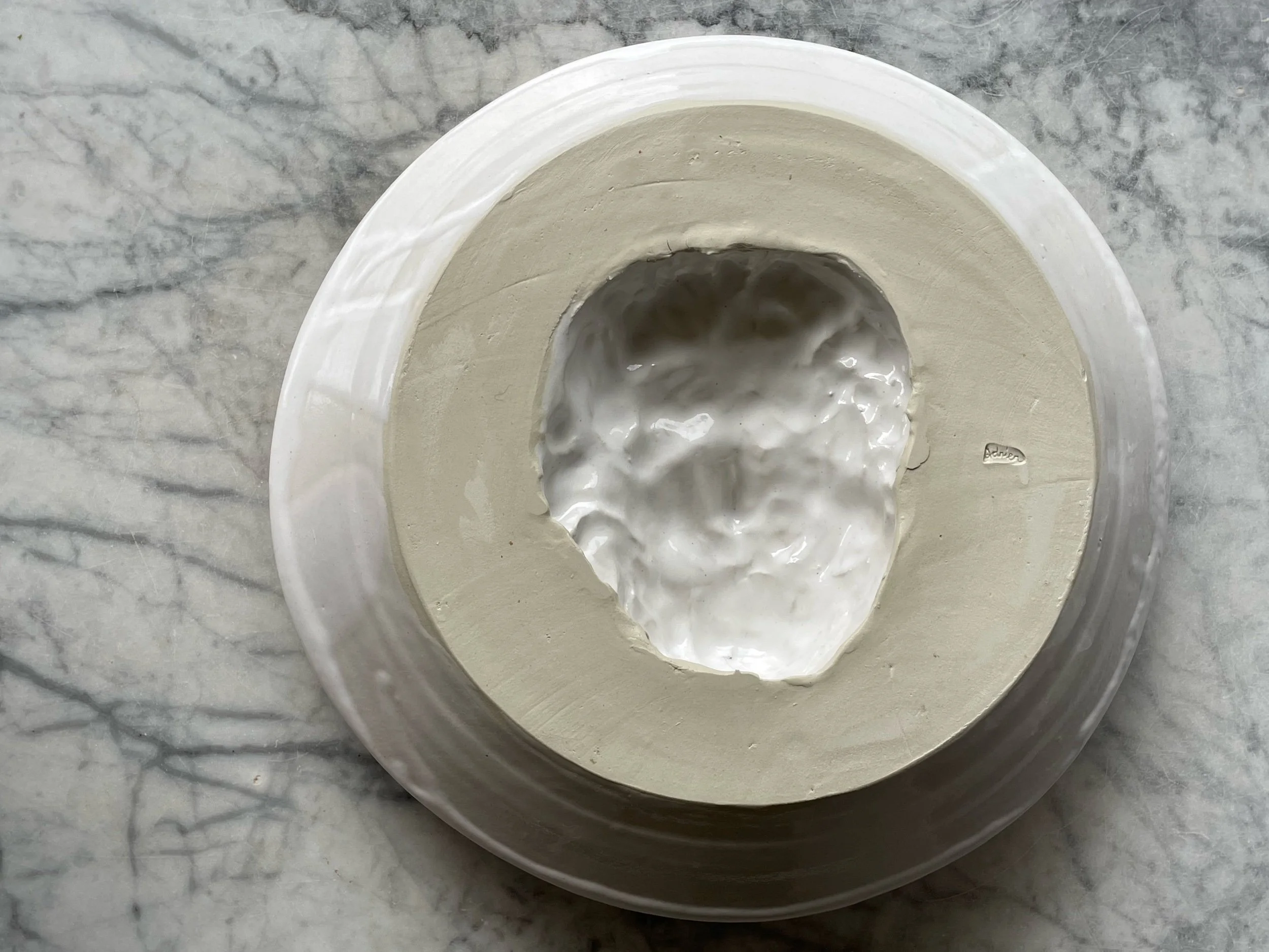 Glazed stoneware. 13.5 inches diameter by 3” deep. Made to hang on the wall or lay flat.