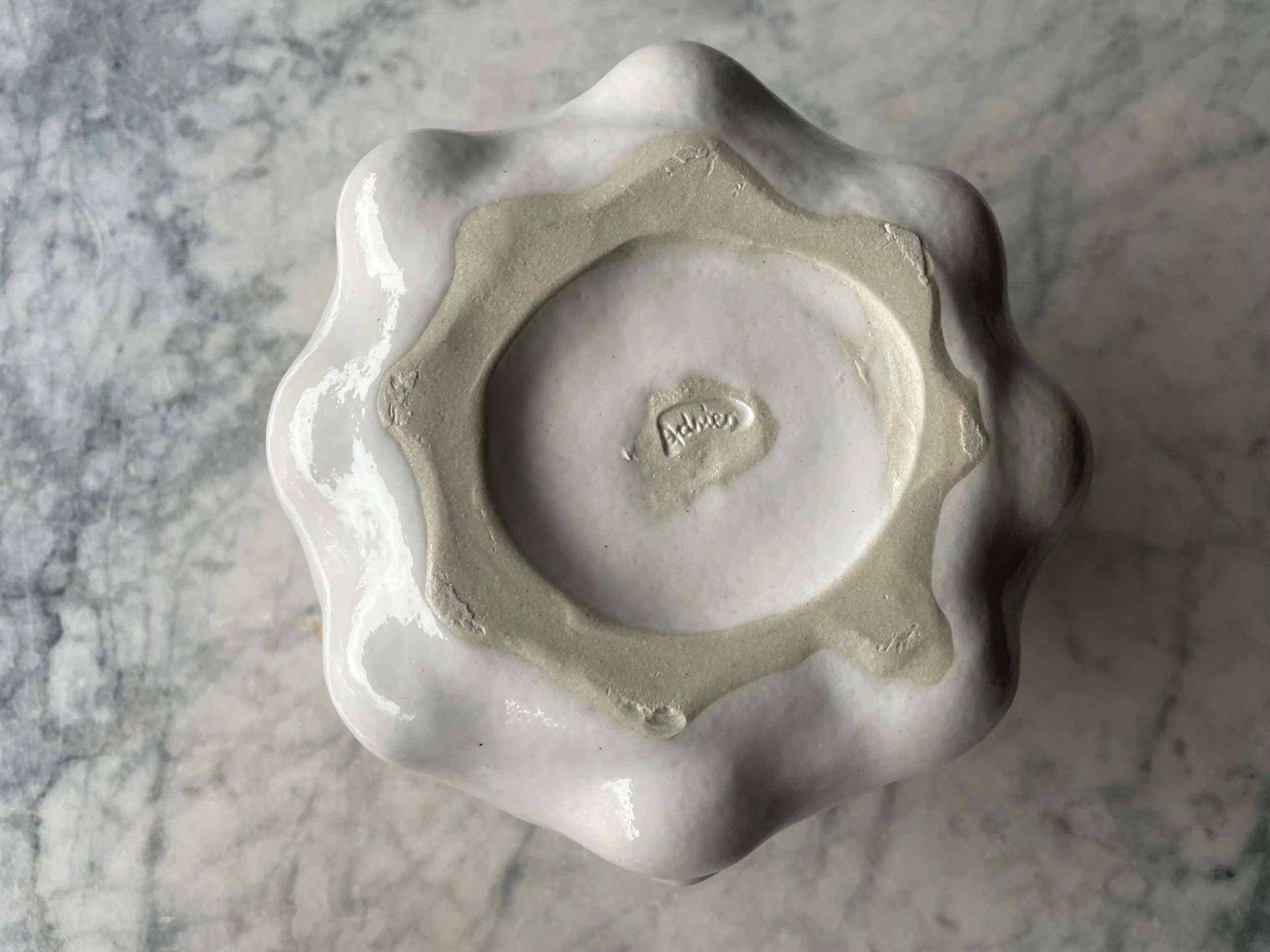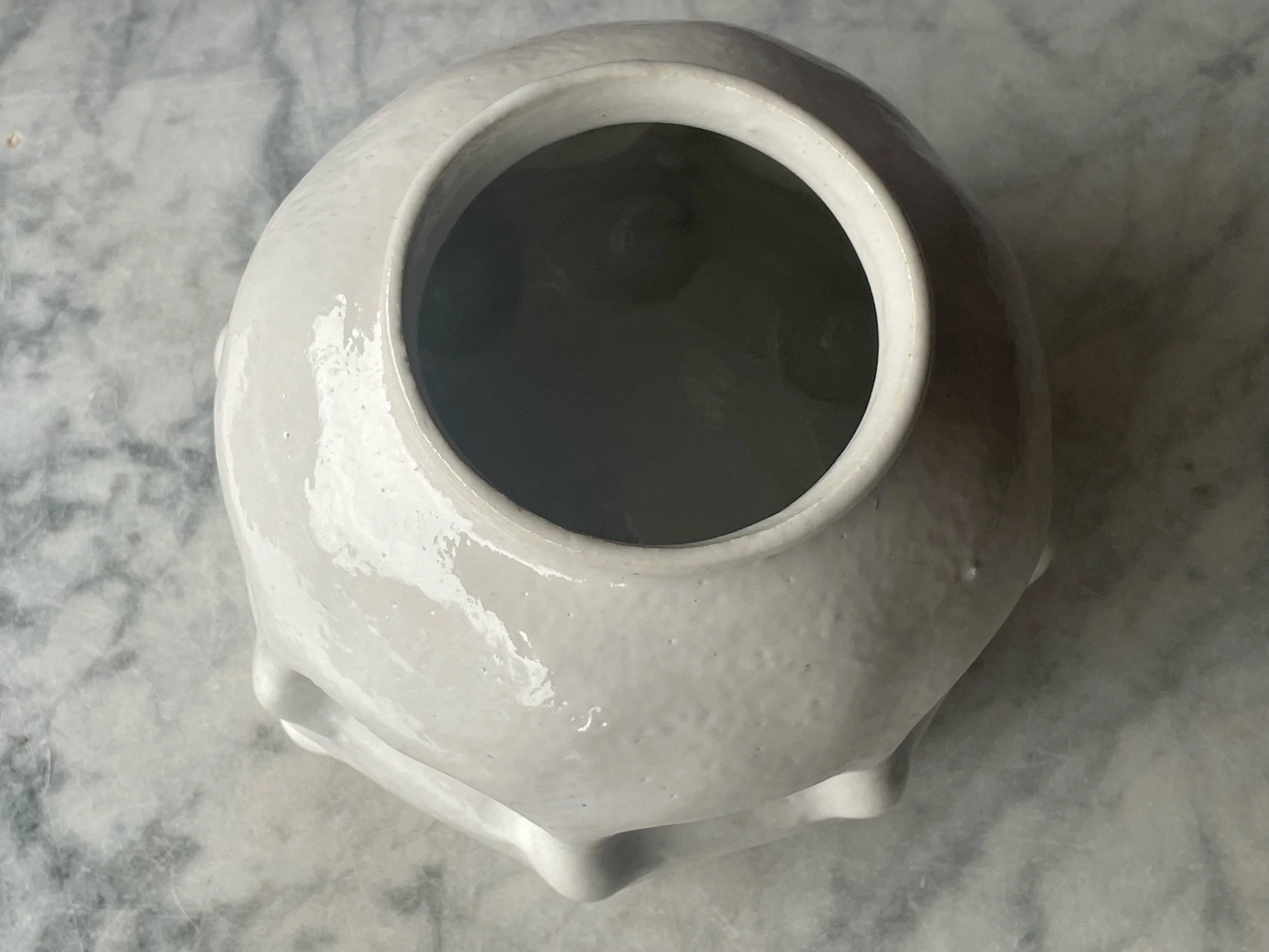 Approximately 5.5” tall by 8” diameter. Made of stoneware clay and white glaze.