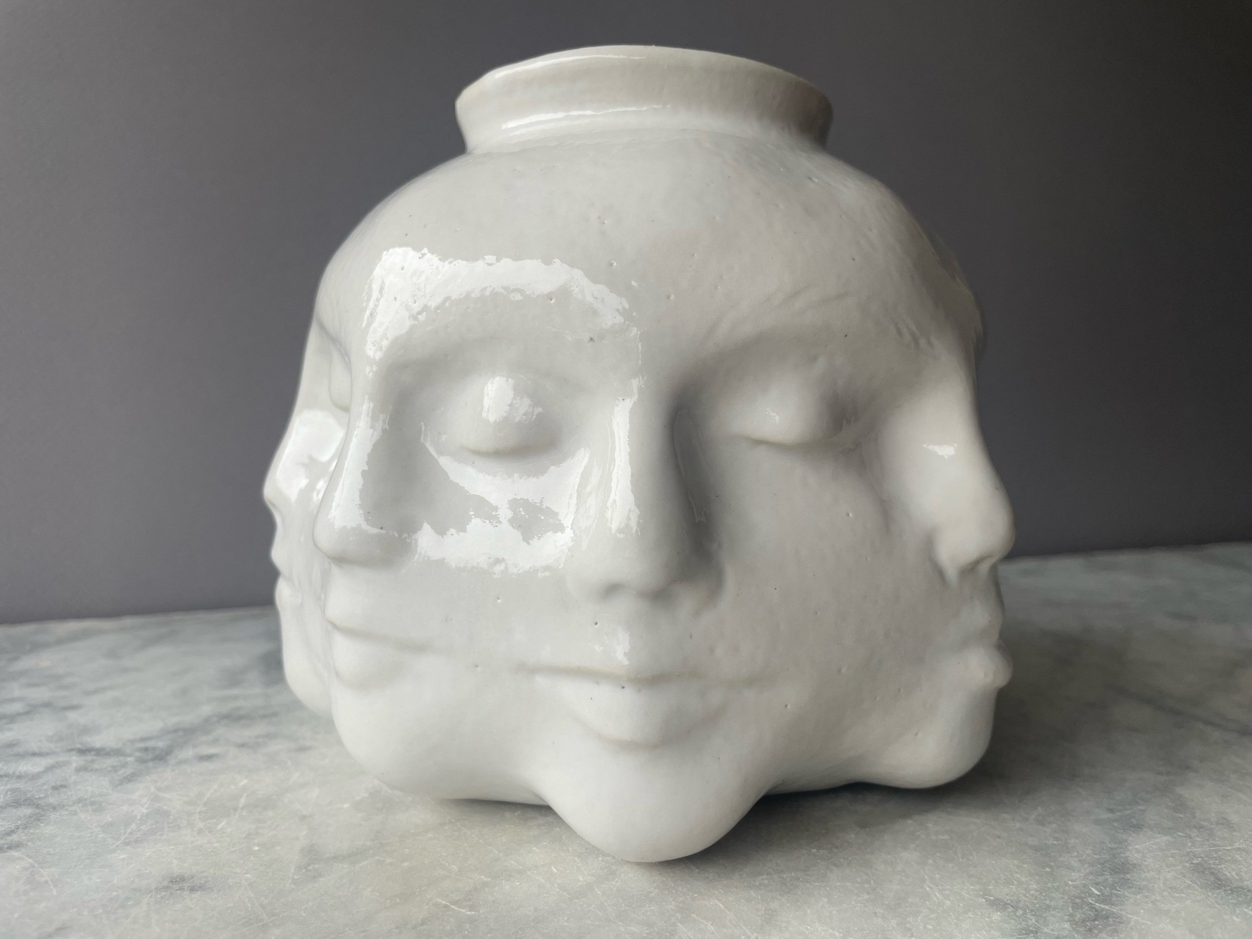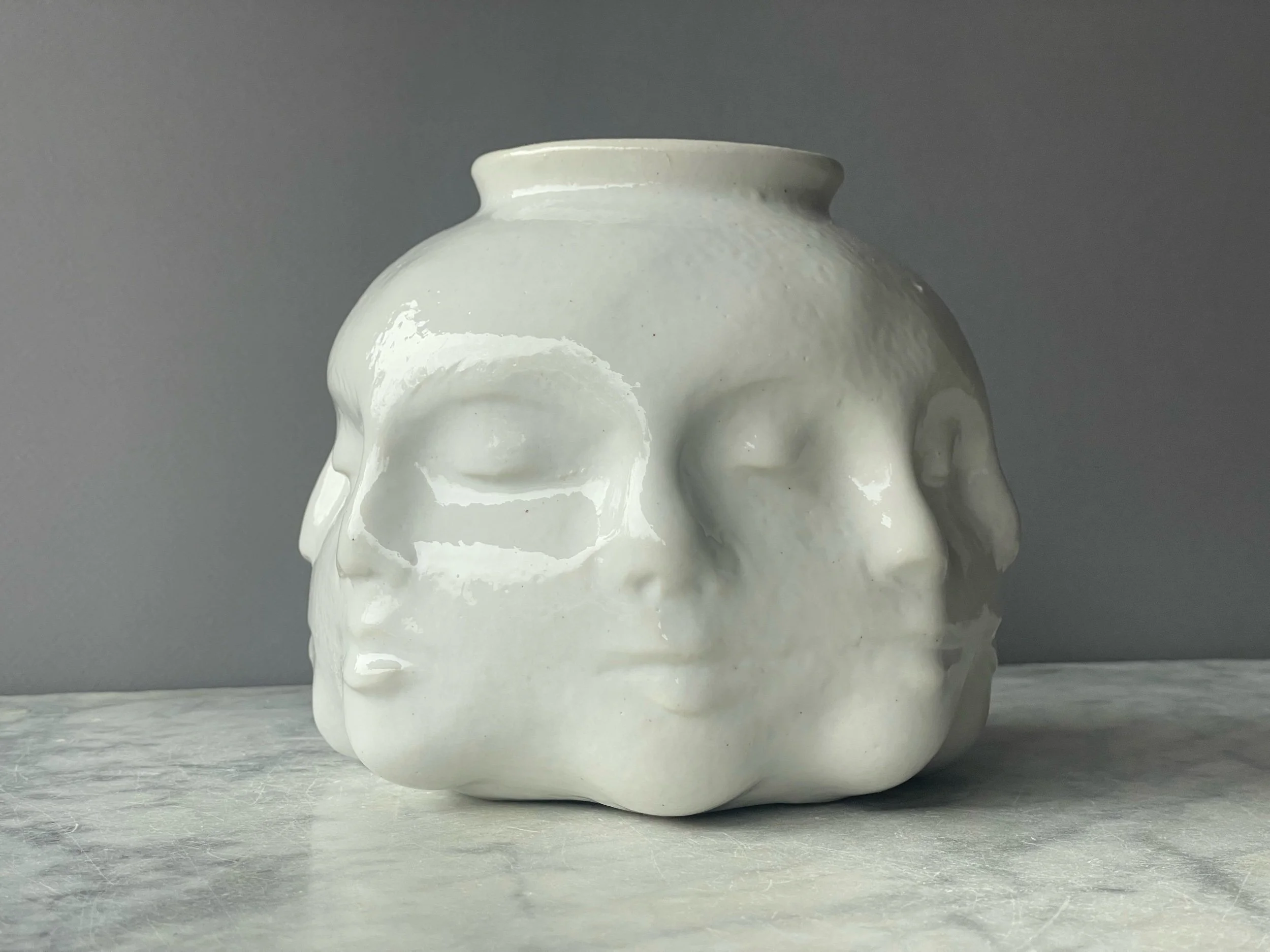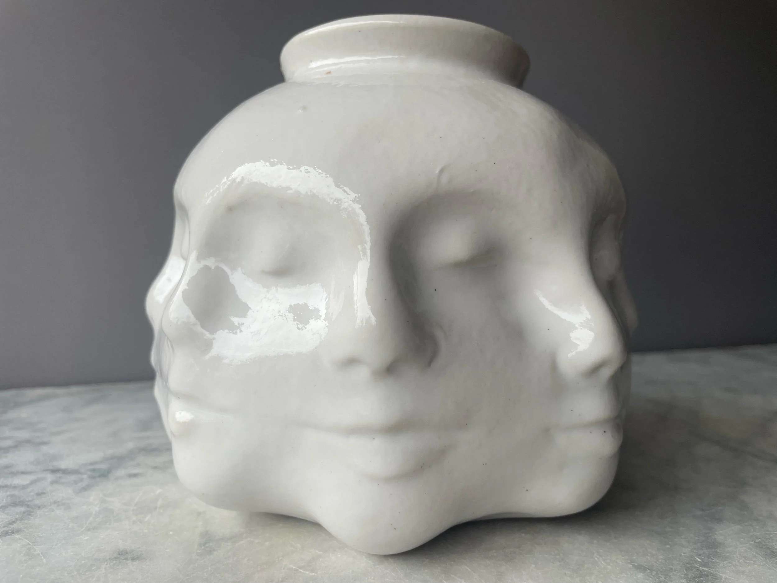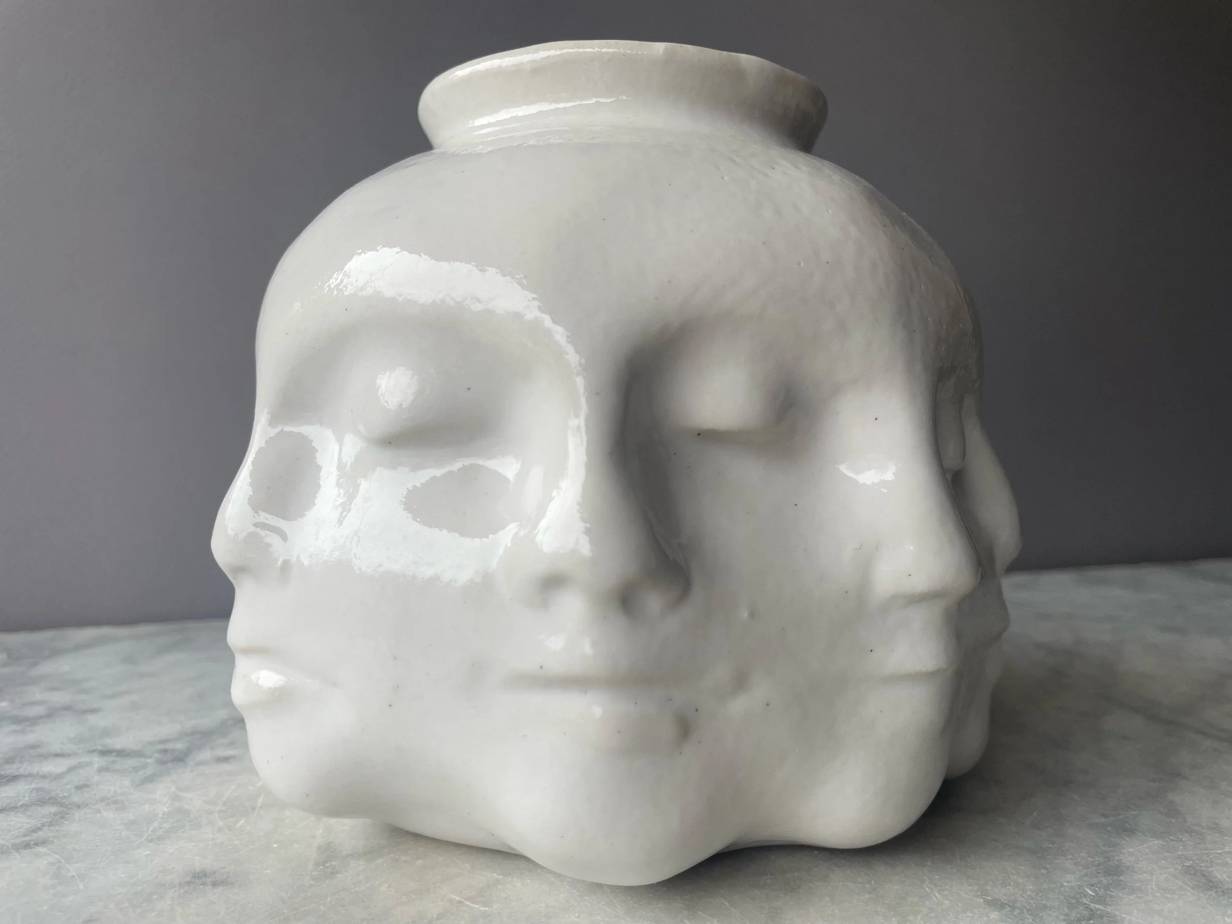 Wheel thrown and hand sculpted pot with 8 faces sculpted continuously around the outside.