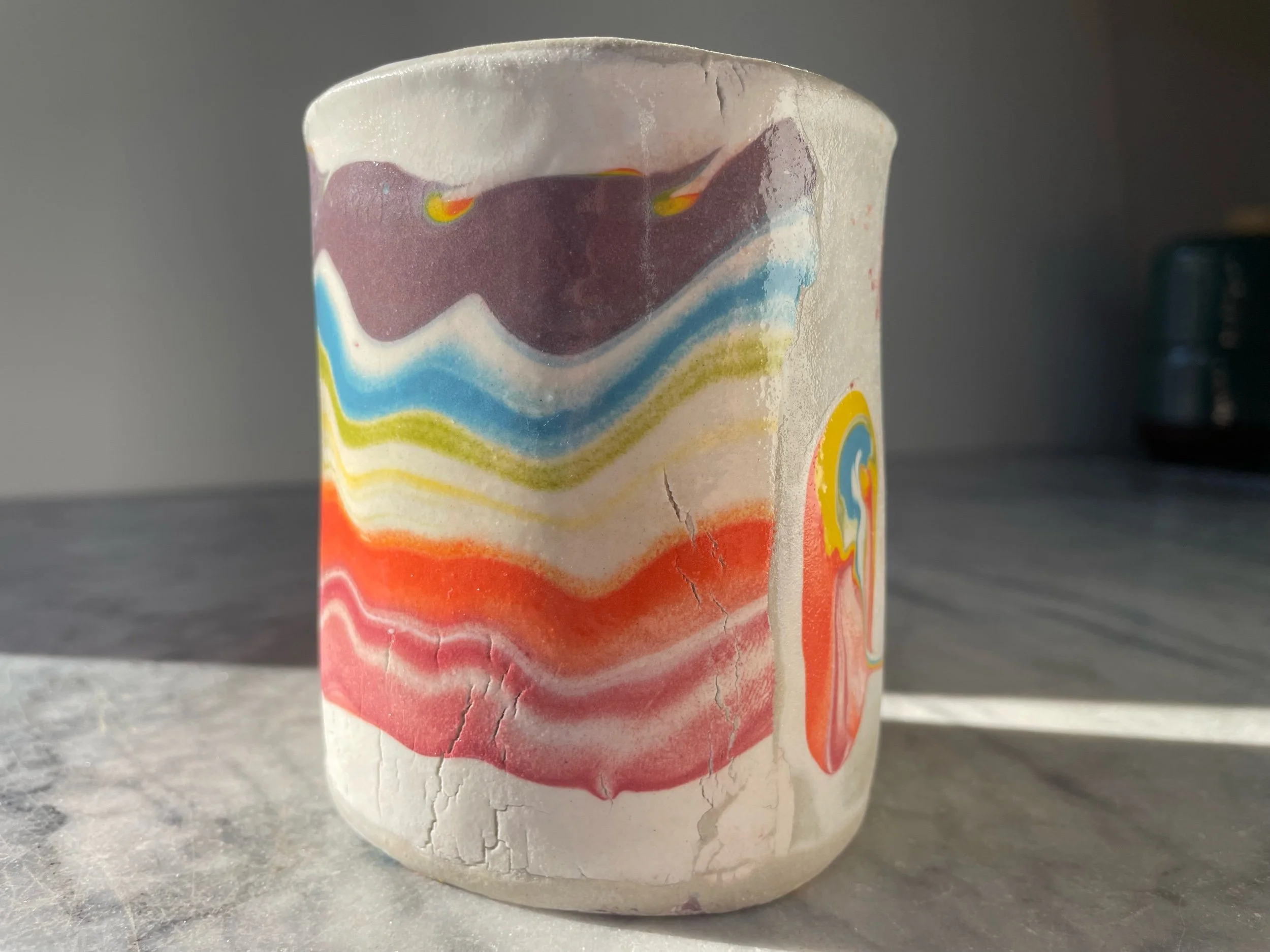 This cup was slab built with marbled colored clays. It has a subtle mud crack texture on the outside.