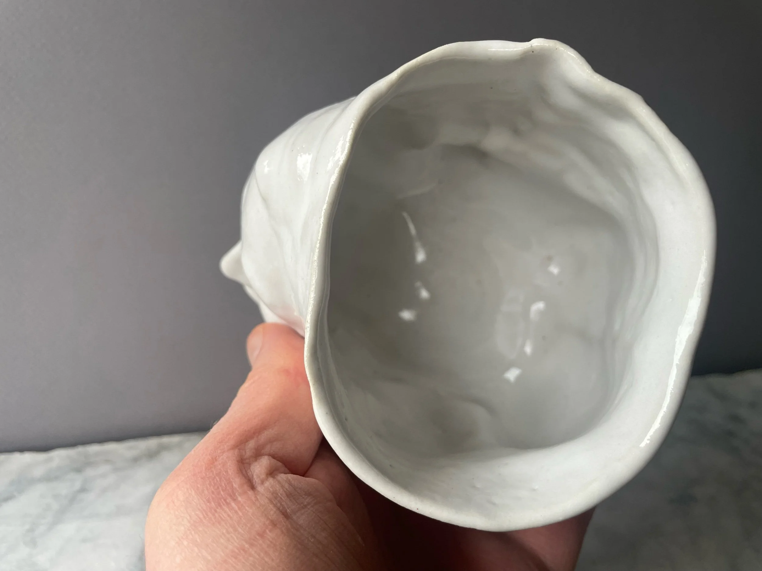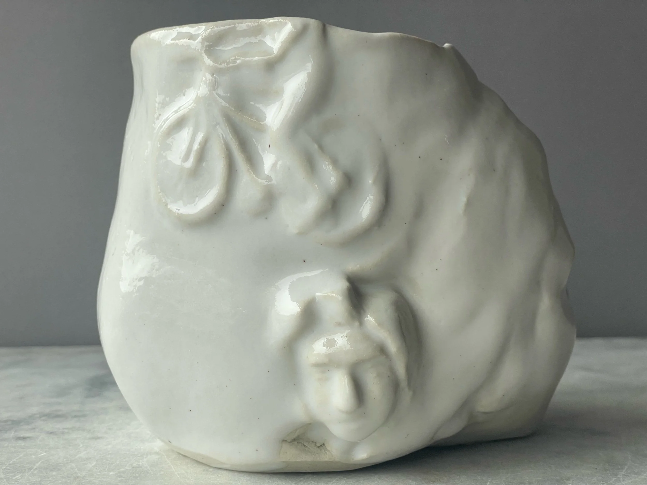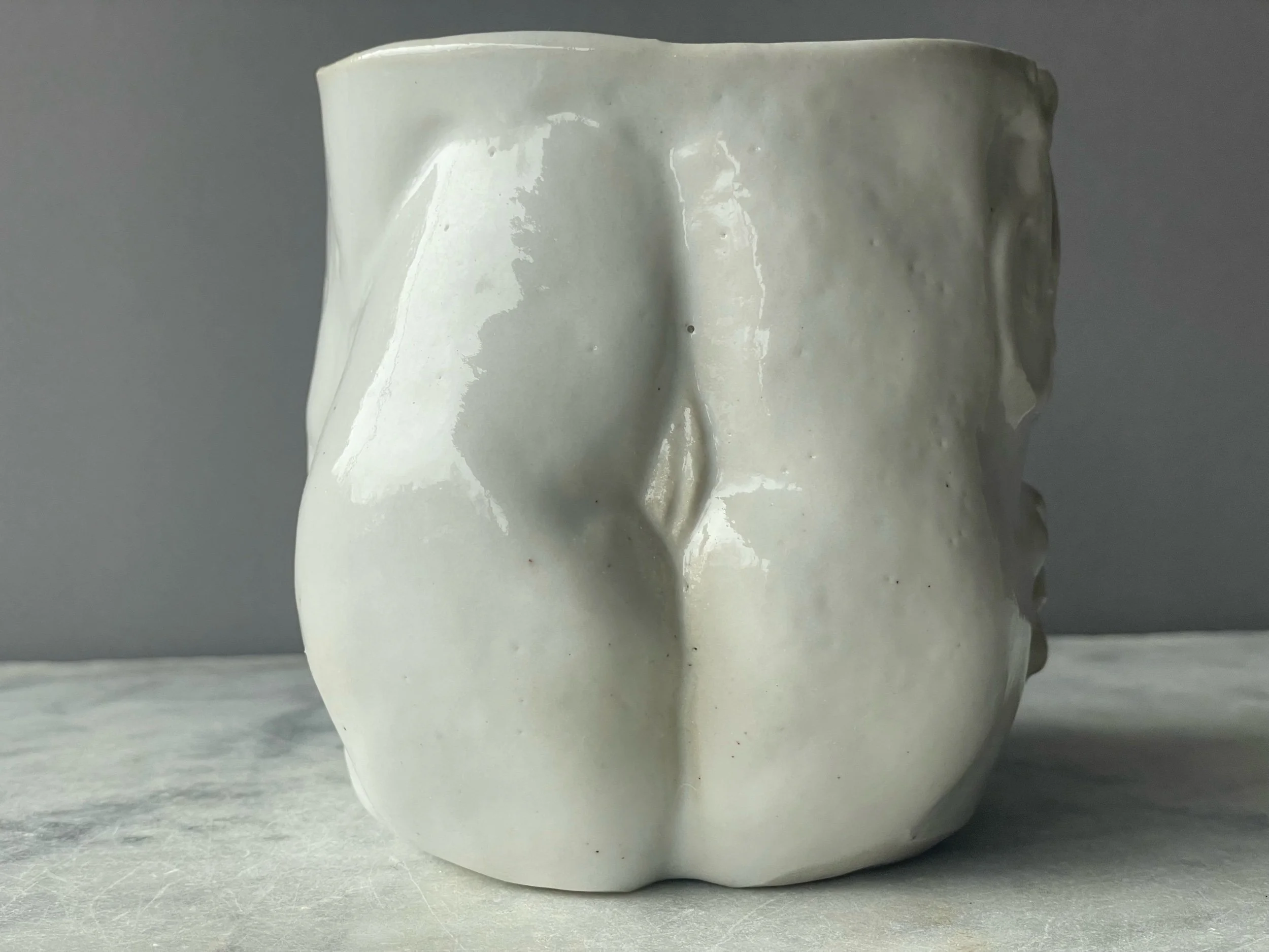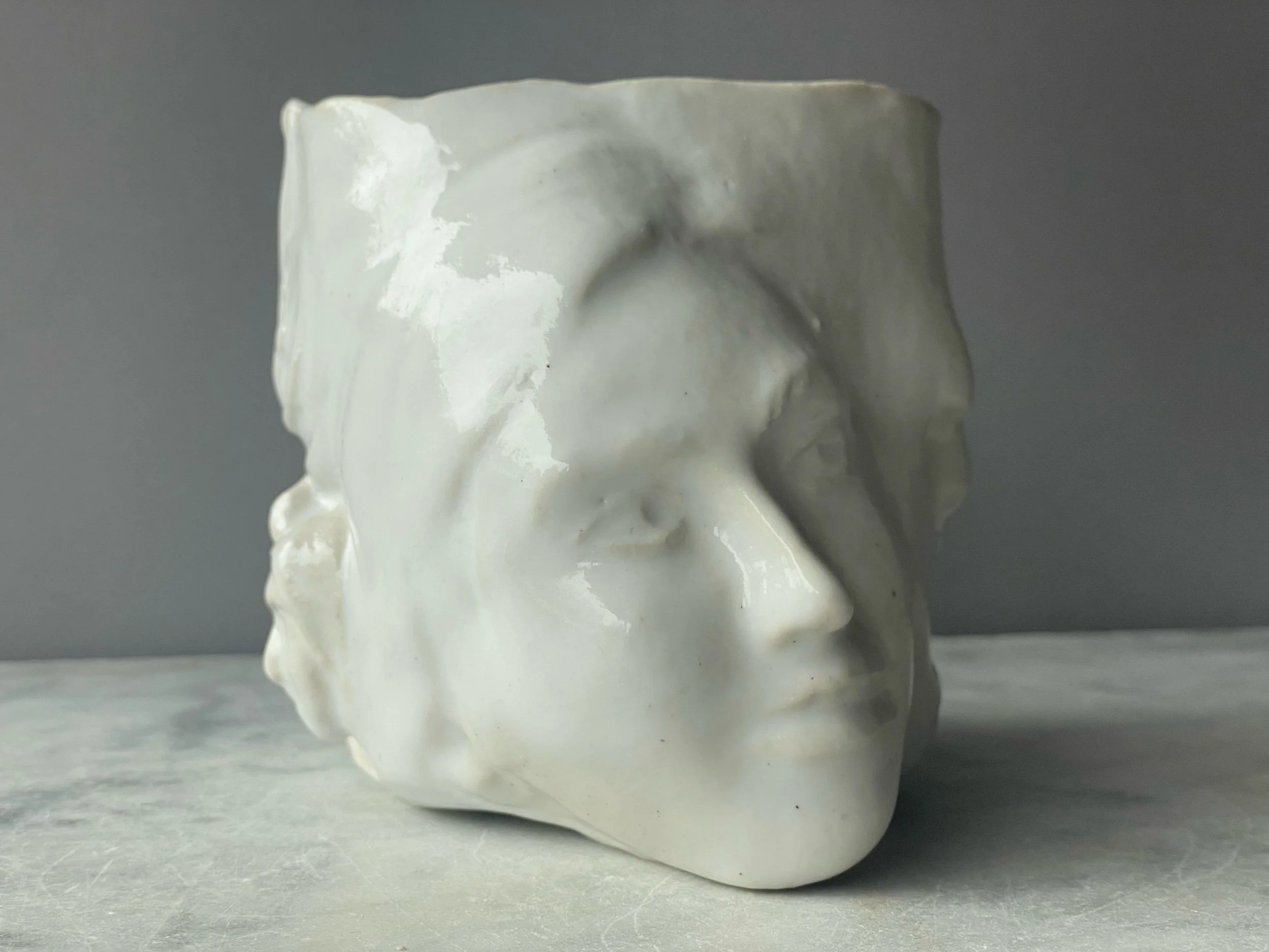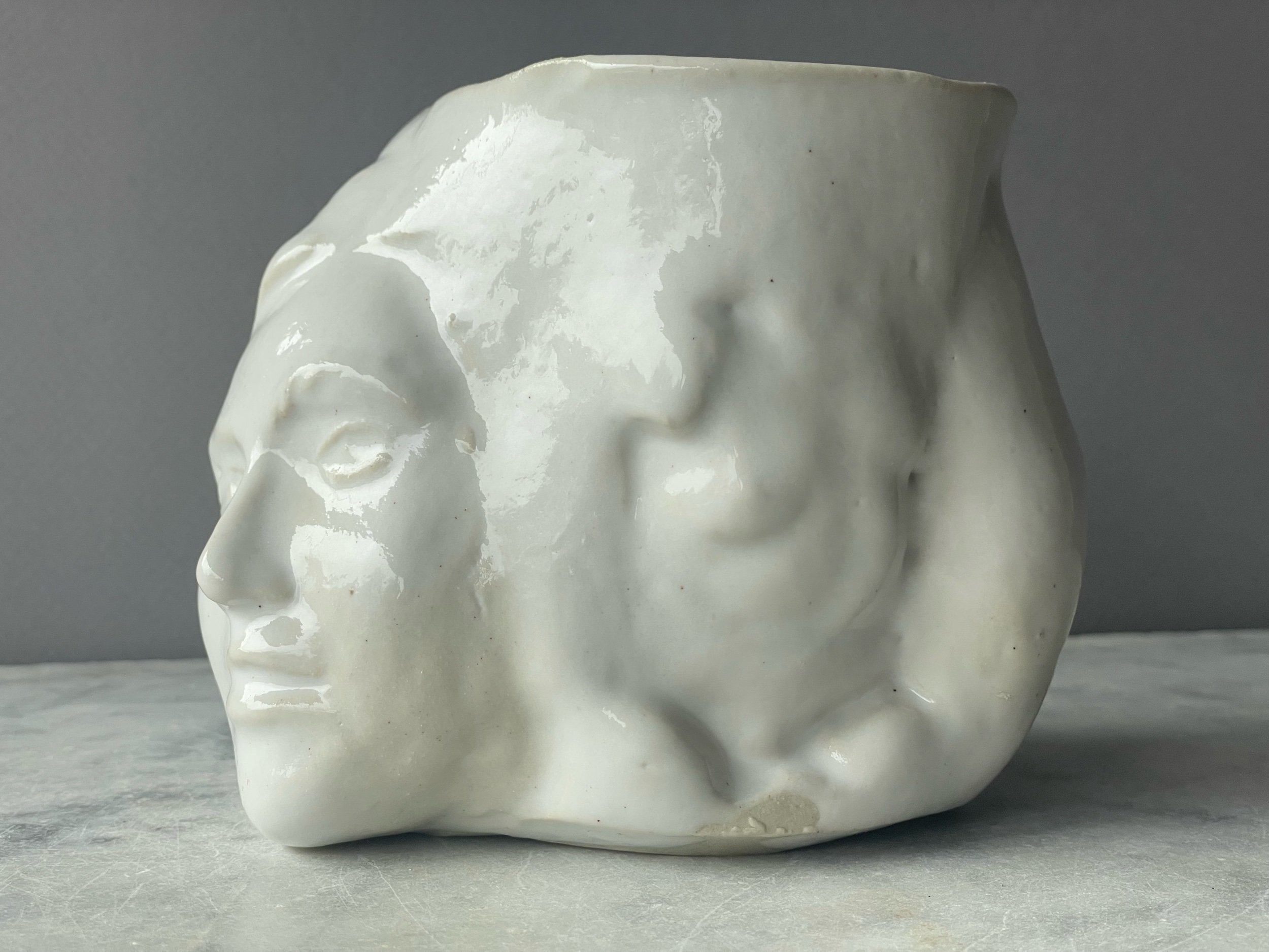 This cup is wheel thrown with sculpted impressions of faces and body parts emerging from the surface.