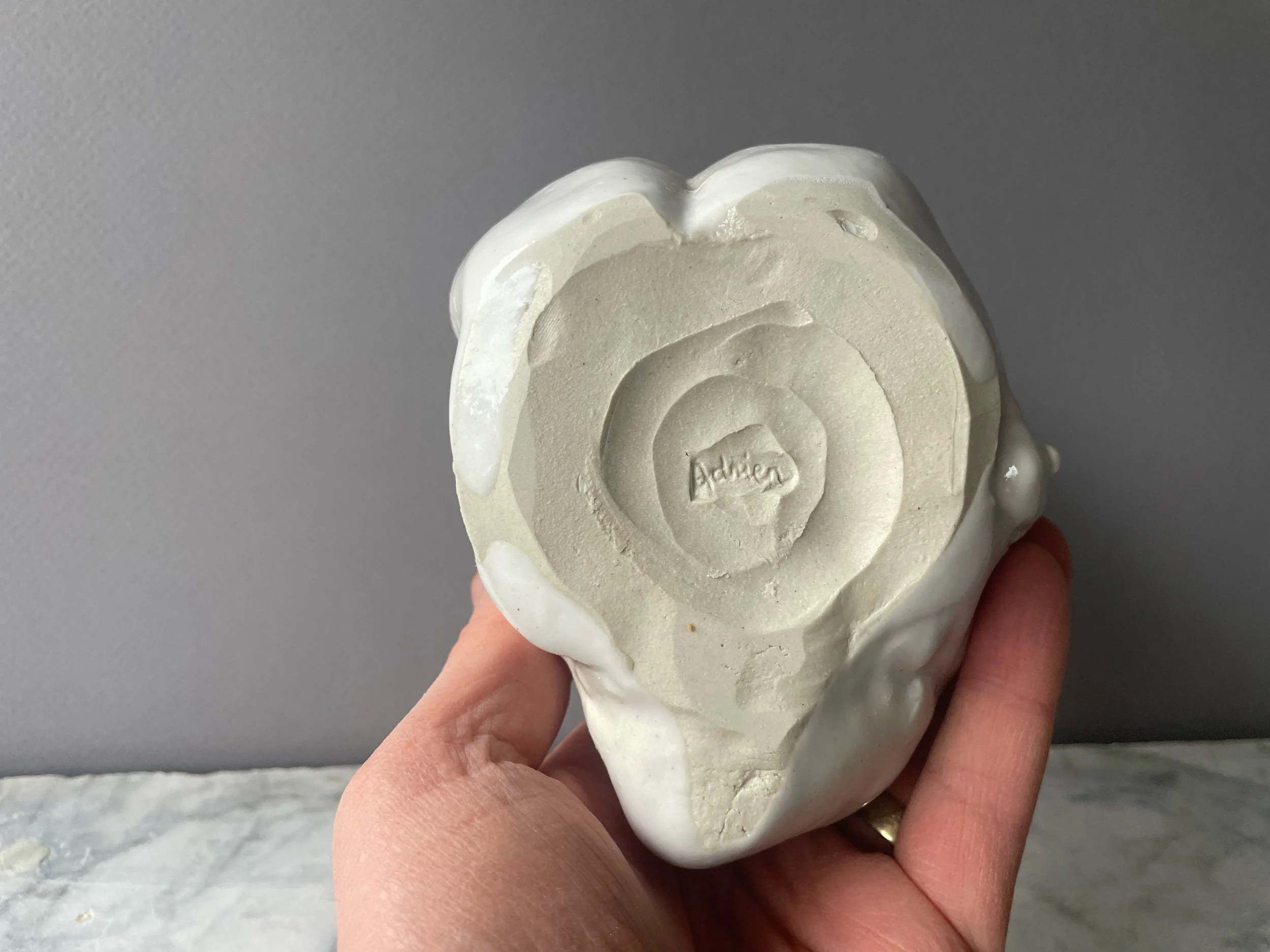 Approximately 4x4x5 inches. Made of stoneware, glazed white.