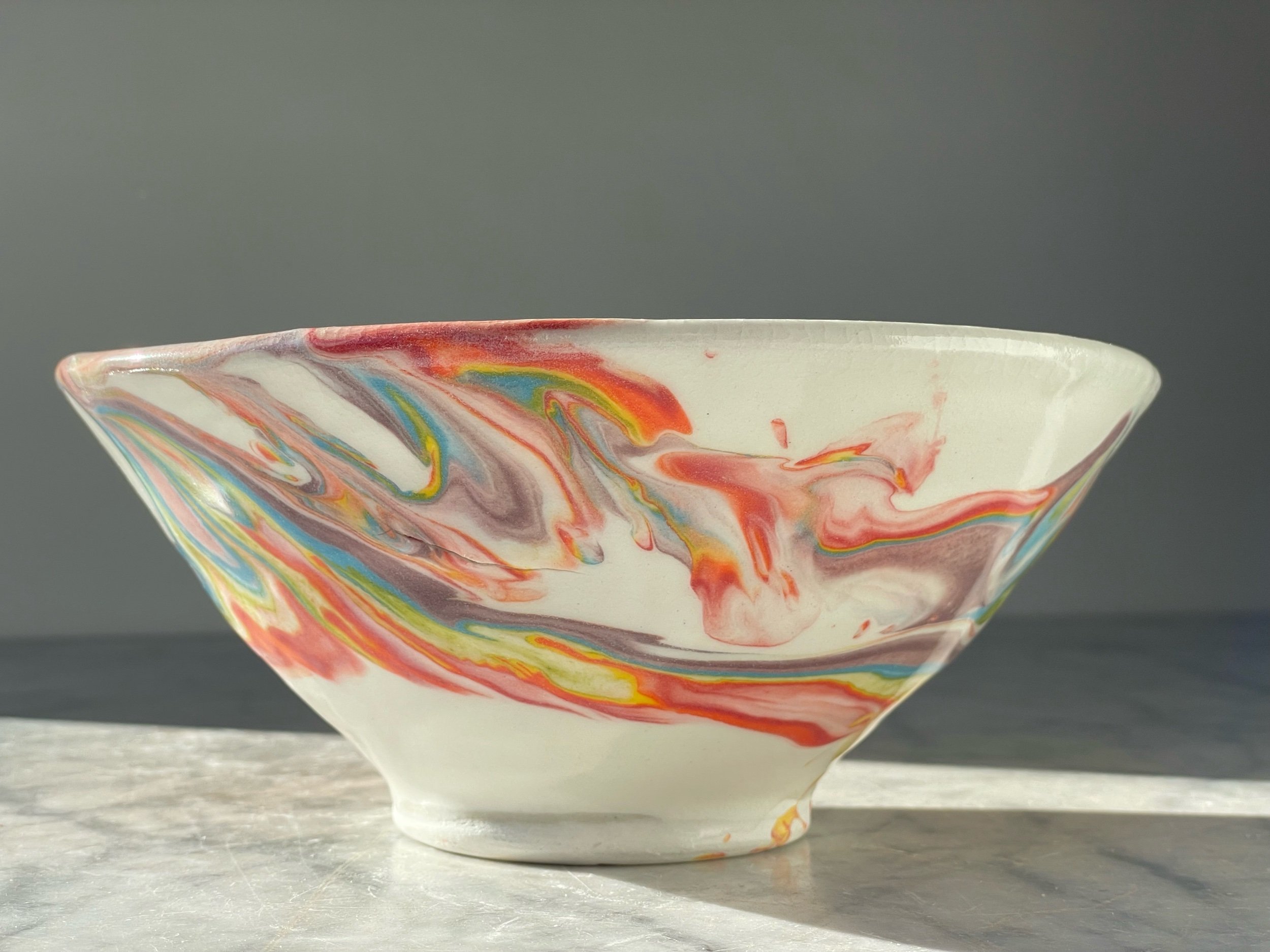 A sweet bowl with some fun rainbows drizzled randomly across the surface.